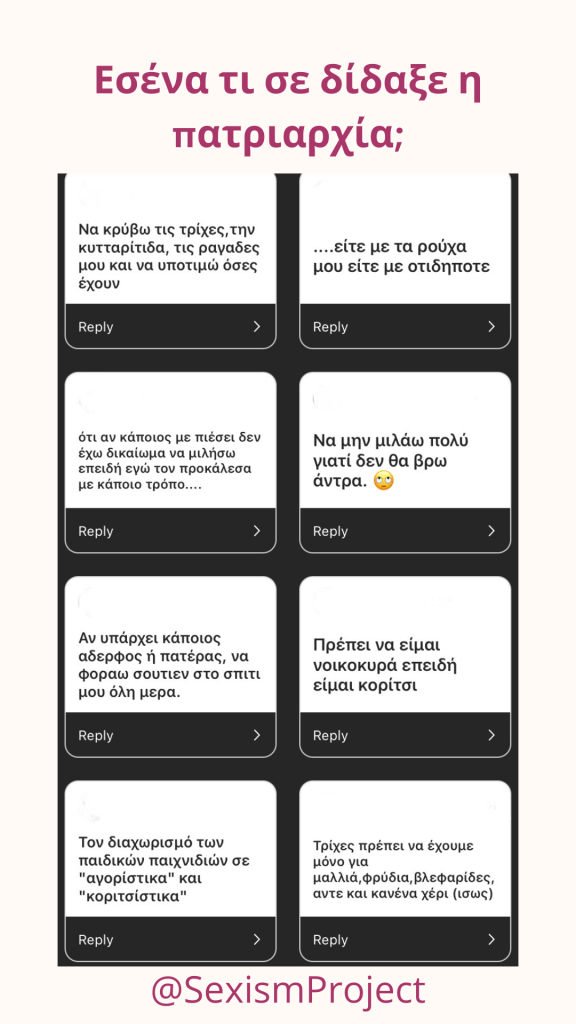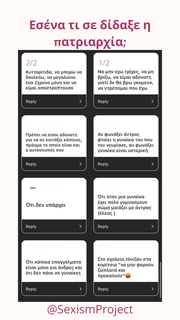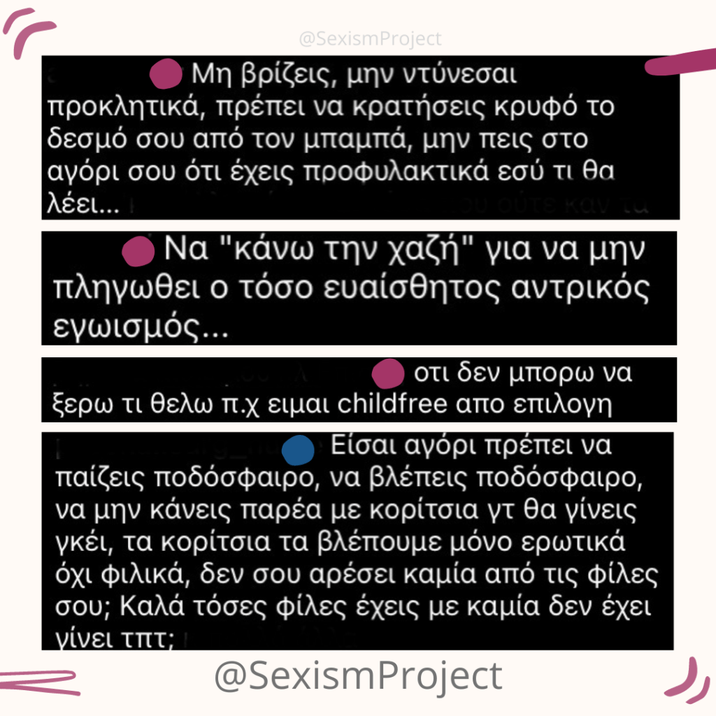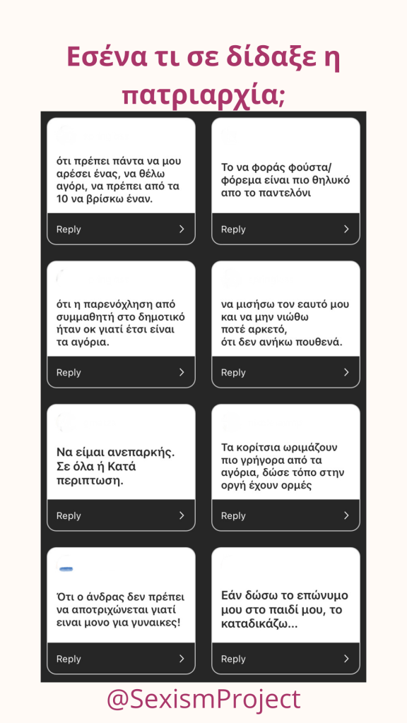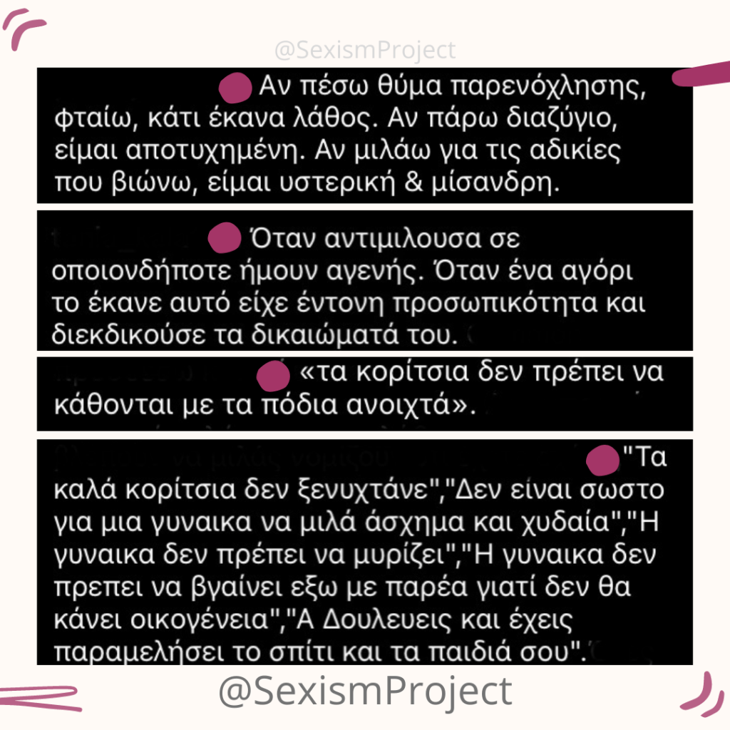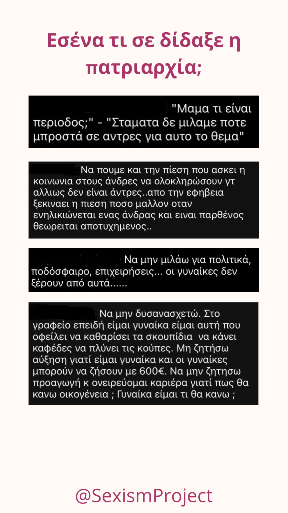 Σε αυτό το ποστ σας ρώτησα για τις δικές σας εμπειρίες και οι απαντήσεις σας συνόψισαν πολύ καλά όλη την έννοια της πατριαρχίας. Νομίζω ότι είναι χρήσιμο να υπάρχουν όλες οι απαντήσεις σας μαζεμένες σε ένα ποστ. Ευχαριστώ πολύ για τη συμμετοχή σας. Μπορείτε να εξακολουθείτε να αφήνετε σχόλια κάτω από αυτό το ποστ με τις δικές σας εμπειρίες.