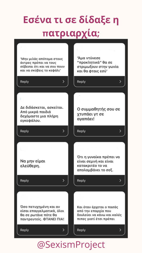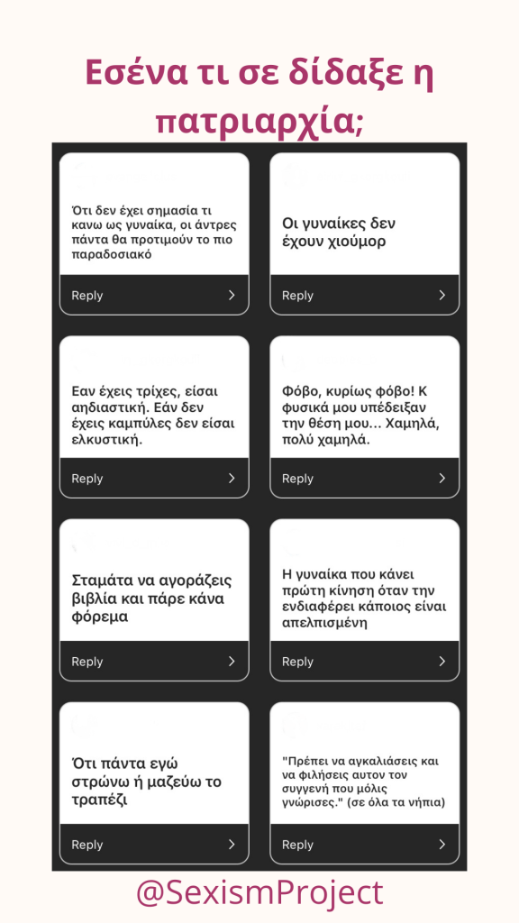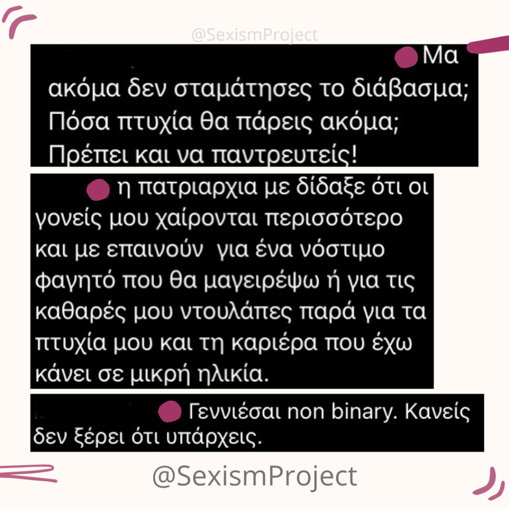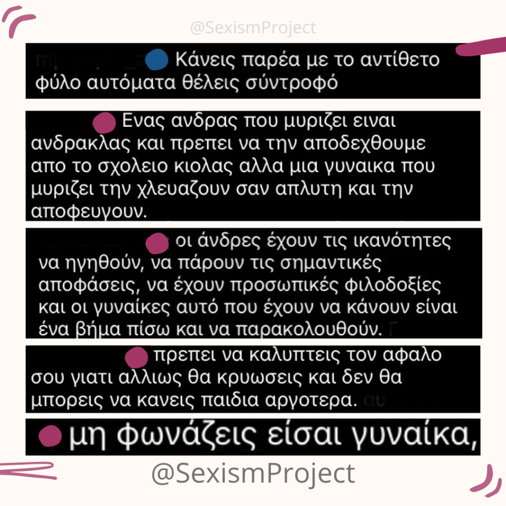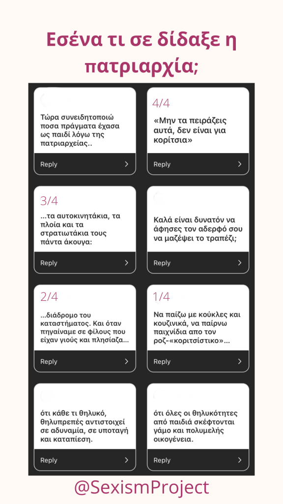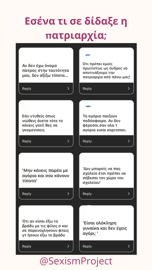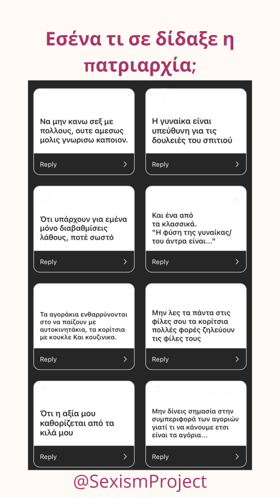 Σε αυτό το ποστ σας ρώτησα για τις δικές σας εμπειρίες και οι απαντήσεις σας συνόψισαν πολύ καλά όλη την έννοια της πατριαρχίας. Νομίζω ότι είναι χρήσιμο να υπάρχουν όλες οι απαντήσεις σας μαζεμένες σε ένα ποστ. Ευχαριστώ πολύ για τη συμμετοχή σας. Μπορείτε να εξακολουθείτε να αφήνετε σχόλια κάτω από αυτό το ποστ με τις δικές σας εμπειρίες.