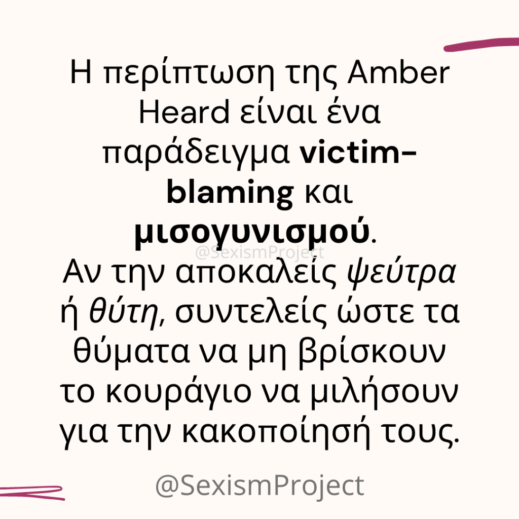 Η περίπτωση της Amber Heard είναι ένα παράδειγμα victim-blaming και μισογυνισμού. Αν την αποκαλείς ψεύτρα ή θύτη, συντελείς ώστε τα θύματα να μη βρουν το κουράγιο να μιλήσουν για την κακοποίησή τους.