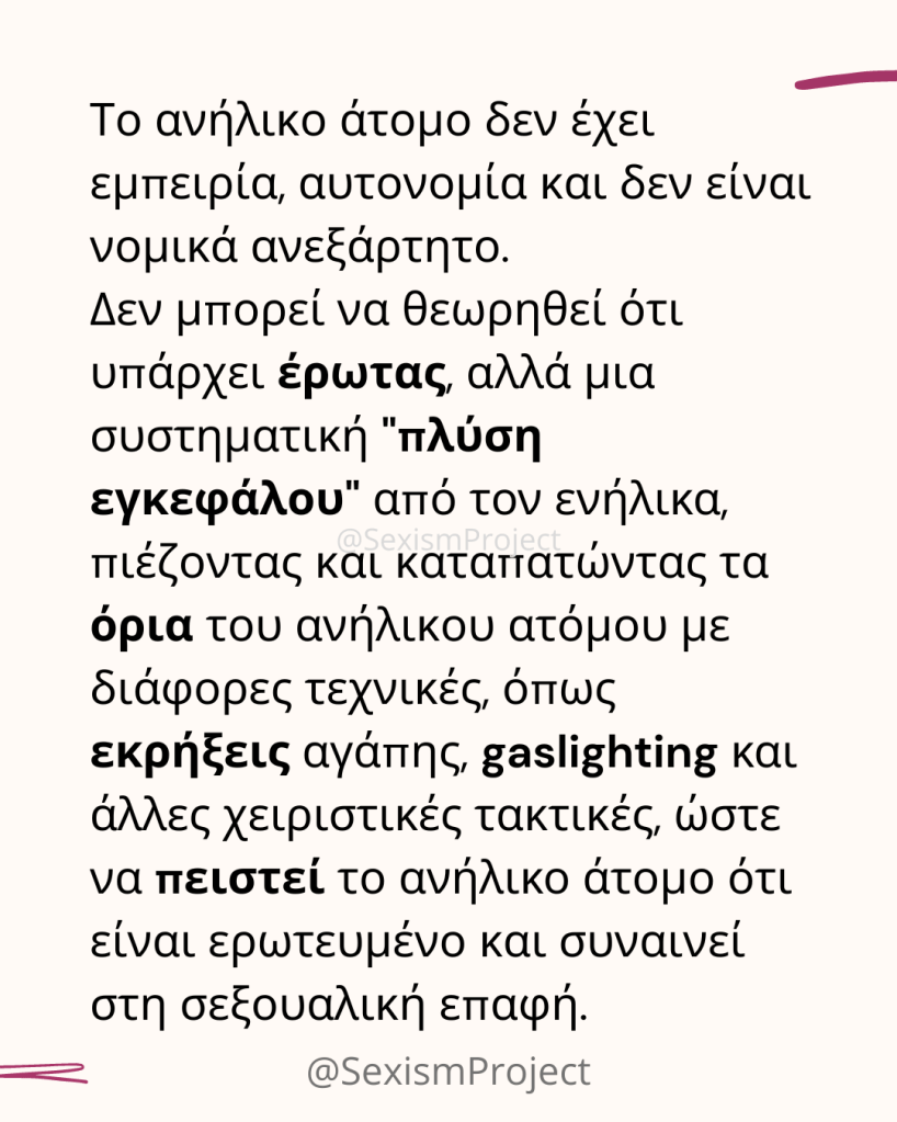 «Με είχε ερωτευτεί, μου το είχε ζητήσει!» είναι μια άποψη που αγνοεί την διαφορετική δυναμική που έχει μια σχέση λόγω της μεγάλης διαφοράς ηλικίας ή λόγω της θέσης κύρους που έχει ο ενήλικας στη ζωή του ανηλίκου. Το ανήλικο άτομο δεν έχει την εμπειρία, την αυτονομία και δεν είναι νομικά ανεξάρτητο. Δεν μπορεί, λοιπόν, να θεωρηθεί ότι υπάρχει έρωτας, αλλά μια συστηματική «πλύση εγκεφάλου» από τον ενήλικα, πιέζοντας και καταπατώντας τα όρια του ανήλικου ατόμου με διάφορες τεχνικές, όπως εκρήξεις αγάπης, gaslighting και άλλες χειριστικές τακτικές, ώστε να πειστεί το ανήλικο άτομο ότι είναι ερωτευμένο και συναινεί στη σεξουαλική επαφή.