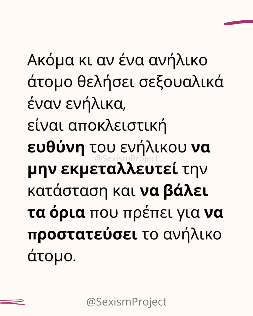 Ακόμα κι αν ένα ανήλικο άτομο θελήσει σεξουαλικά έναν ενήλικα, είναι αποκλειστική ευθύνη του ενήλικου να μην εκμεταλλευτεί την κατάσταση και να βάλει τα όρια που πρέπει για να προστατεύσει το ανήλικο άτομο.