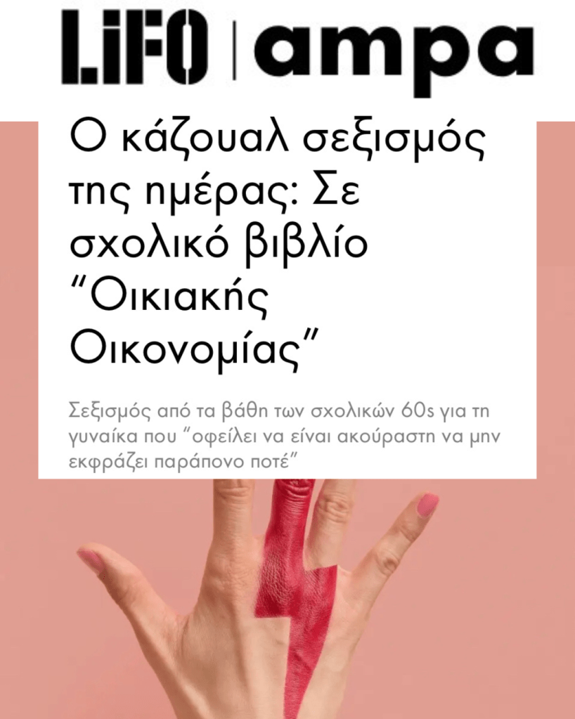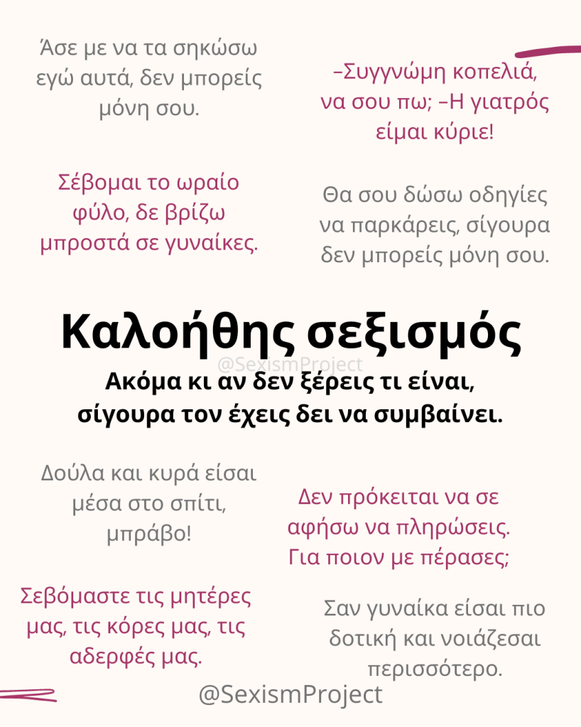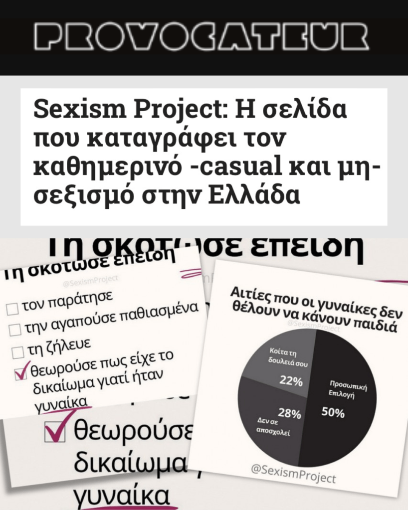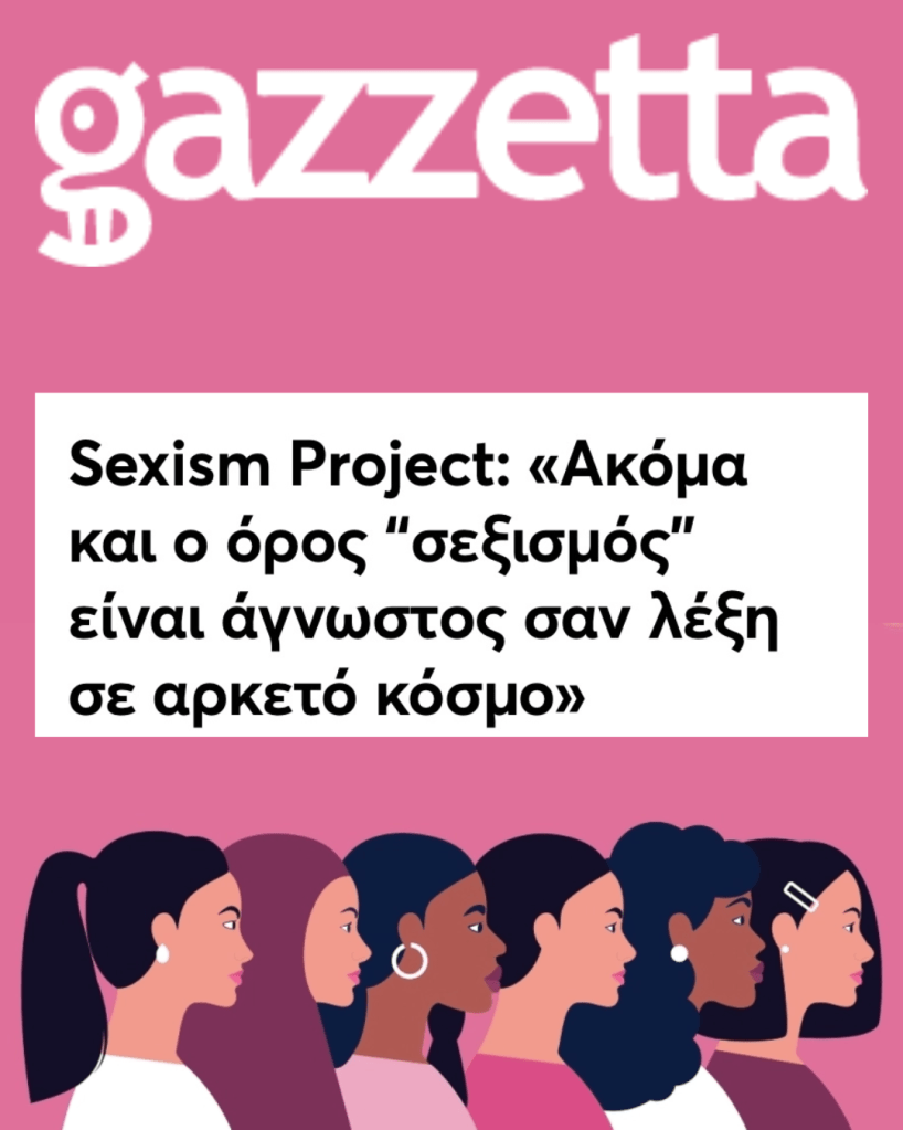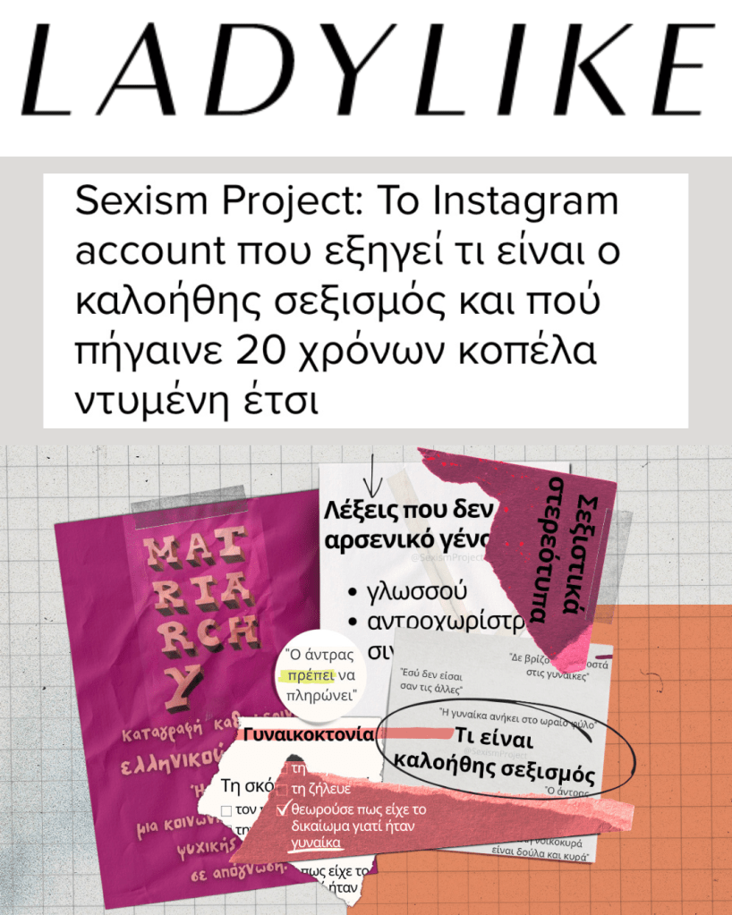 Έχω φτιάξει το λογαριασμό @SexismProject στο Instagram, όπου συζητάμε για τα κοινωνικά στερεότυπα γύρω από όλα τα φύλα, κυρίως όμως το βίωμα του να είσαι γυναίκα ή θηλυκότητα.
